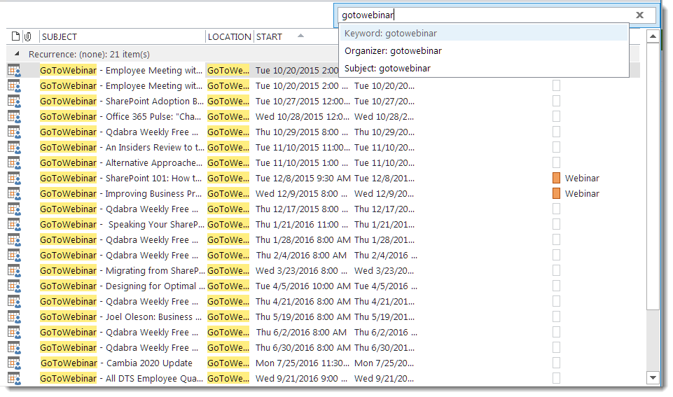Search Outlook Calendar by specific text organizer category subject