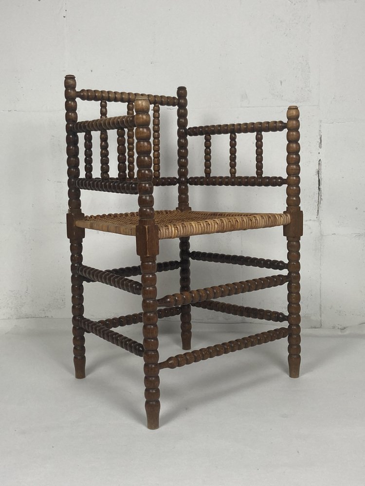 Dutch Bobbin Wood Turned Side Chair with Rattan Wicker Seat 1940s