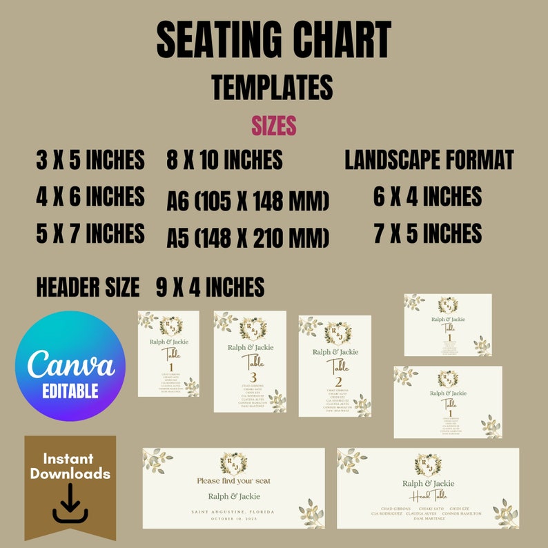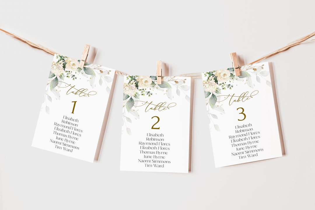 Greenery and Gold Wedding Seating Cards Template Editable Seat Chart