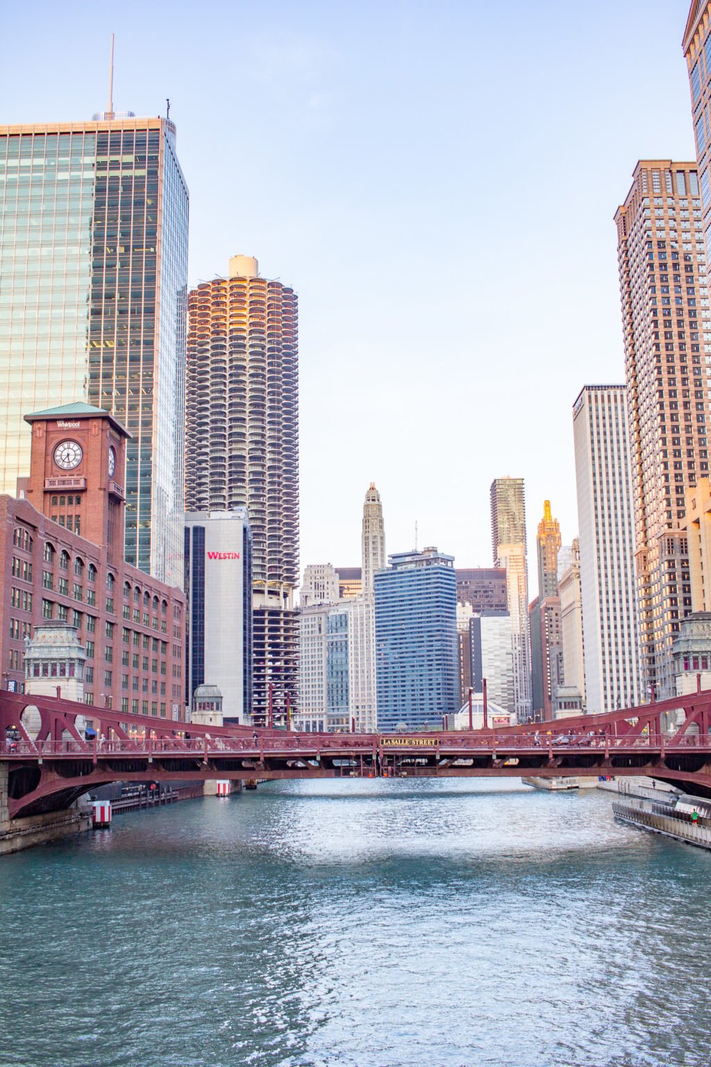 Downtown Chicago buildings as seen from Chicago River at LaSalle Street