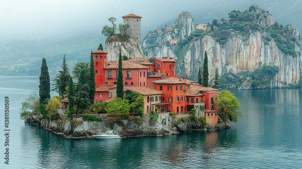 Secluded Island Castle on Lake Garda Italy の Stock イラスト Adobe Stock