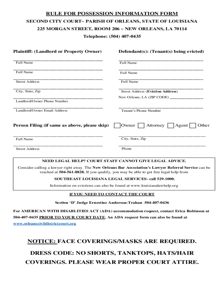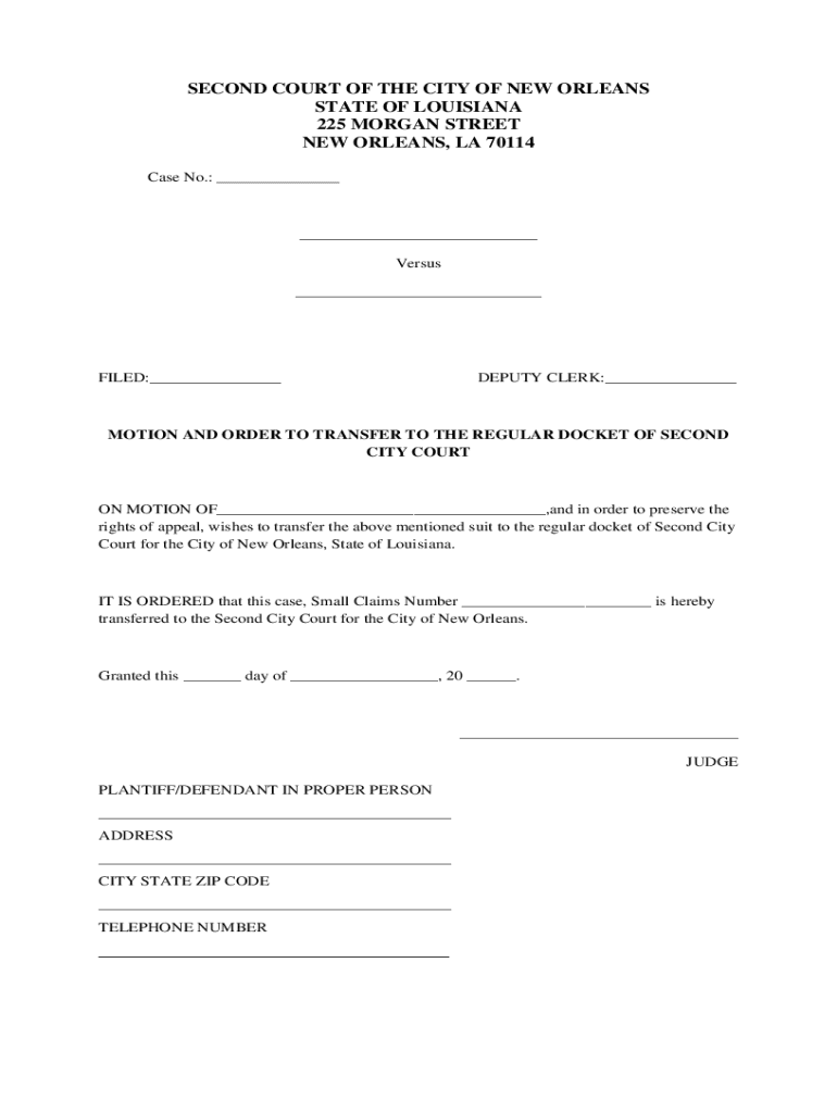 Fillable Online SECOND CITY COURT FOR THE CITY OF NEW ORLEANS STATE OF