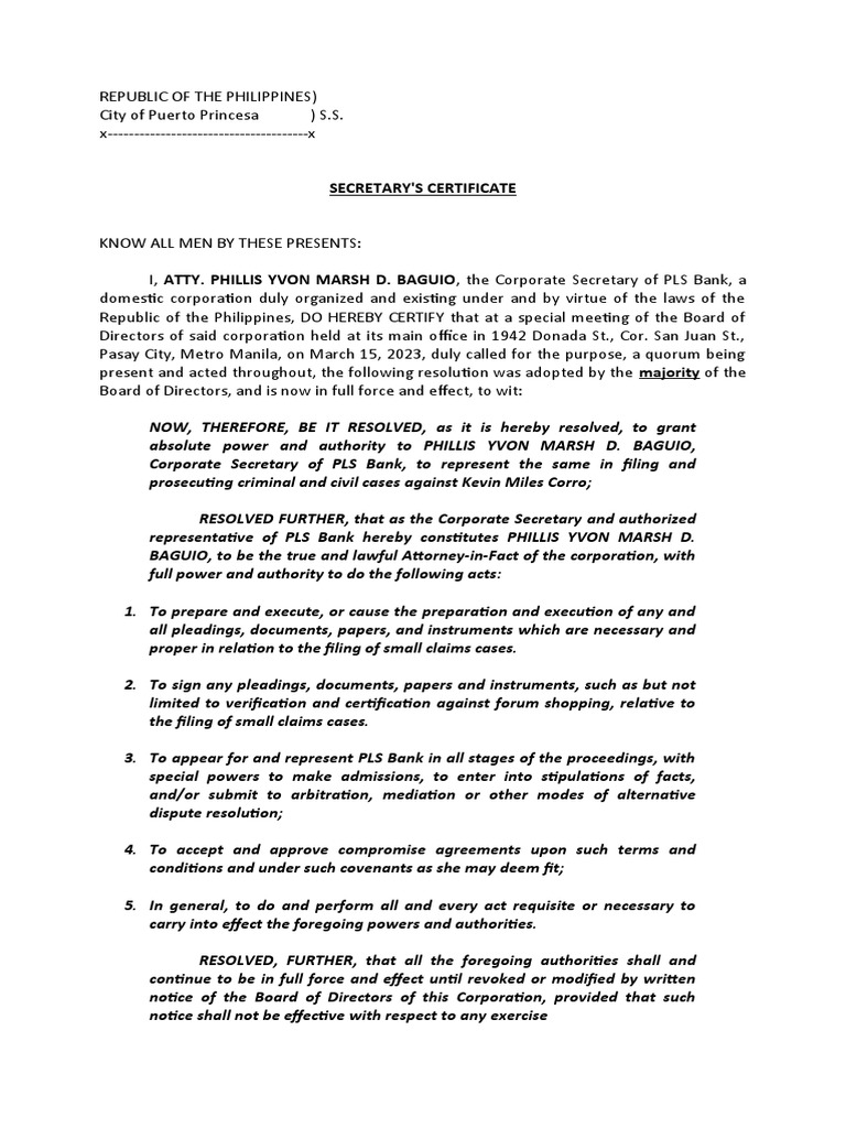 Secretarys Certificate NonExistence Corp Dispute PDF