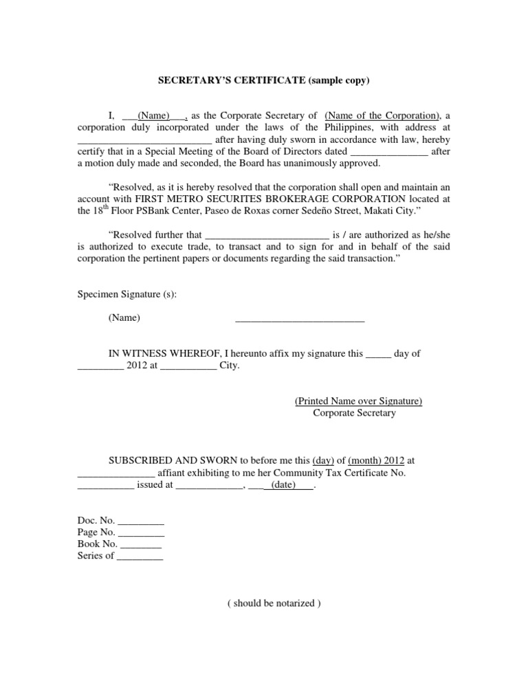 Secretarys Certificate For Account Opening Domestic Corporation PDF