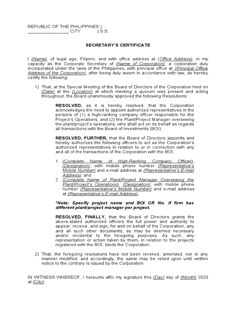 Secretary s Certificate Sample Format PDF