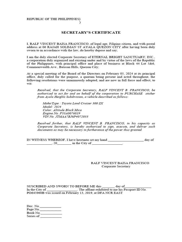 Secretarys Certificate To Purchase Motor Vehicle PDF