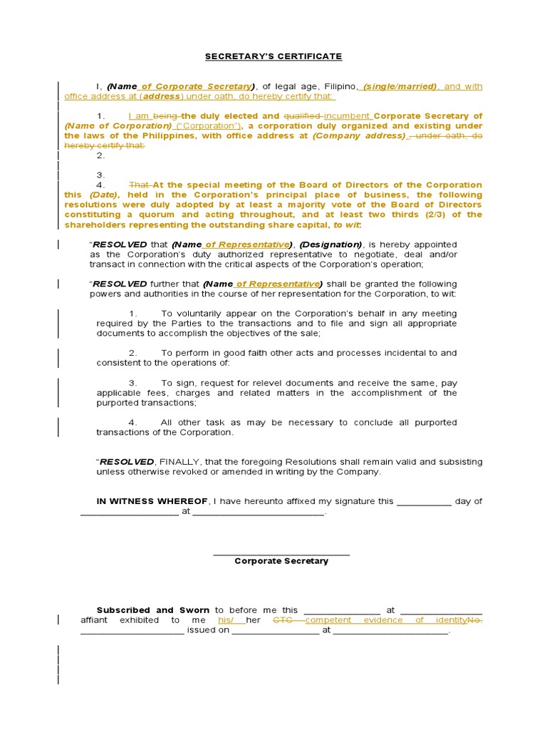 Secretarys Certificate Format PDF