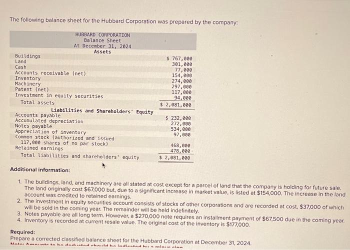 Solved The following balance sheet for the Hubbard Chegg com