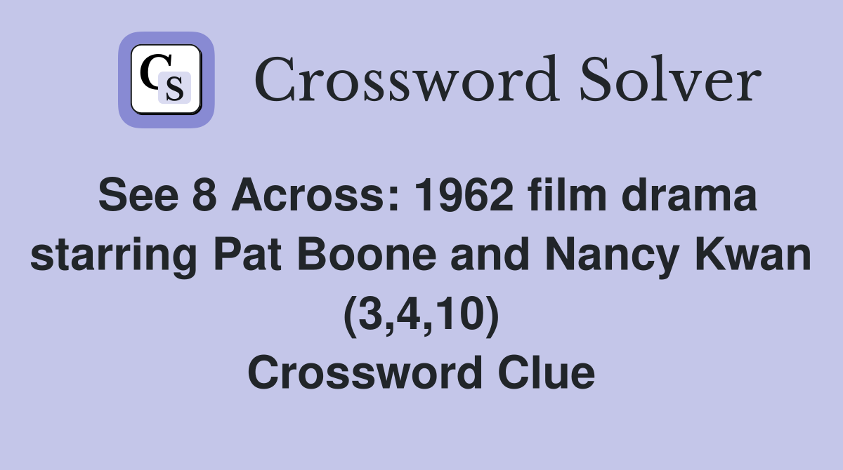 See 8 Across: 1962 film drama starring Pat Boone and Nancy Kwan (3 4 10
