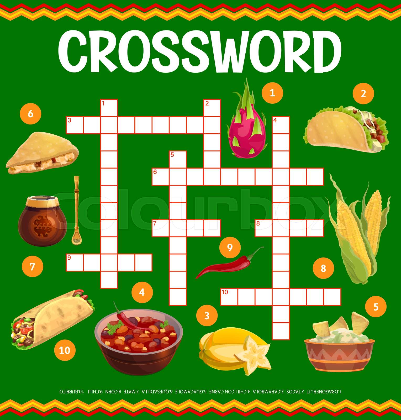 Mexican cuisine food crossword grid worksheet quiz color vector clipart