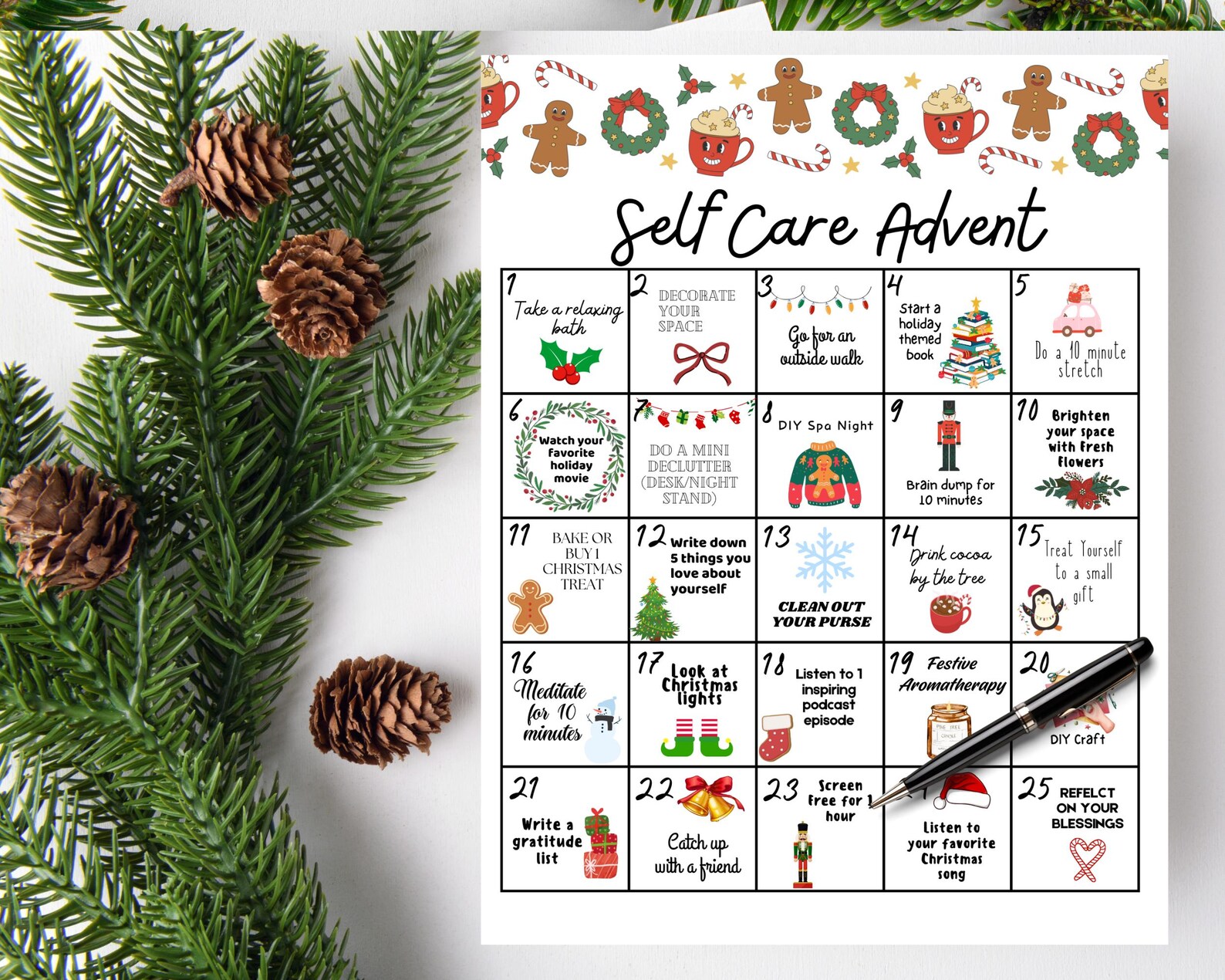 Printable Self Care Advent Calendar Christmas Activity Christmas