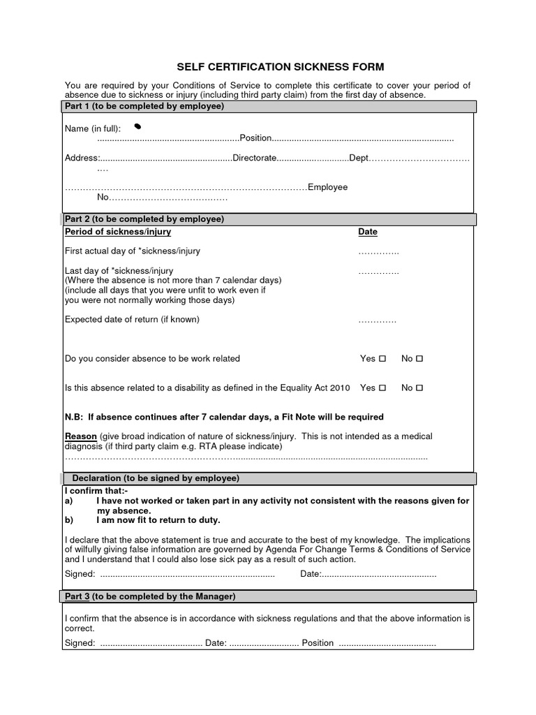 Self Certification Sickness Form PDF