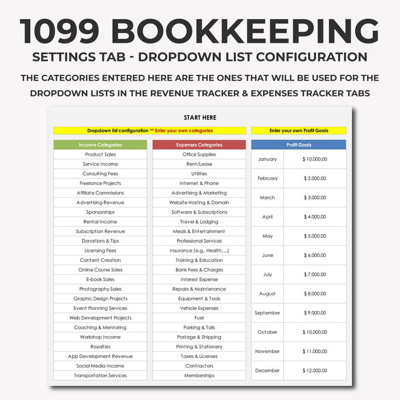 Bookkeeping Spreadsheet Revenue Tracker Expenses Tracker Profit Loss