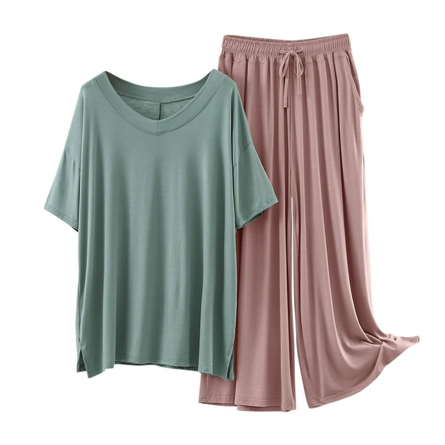 Women Modal Pajamas Set Short Sleeve Top and Wide Leg Pants Lightweight