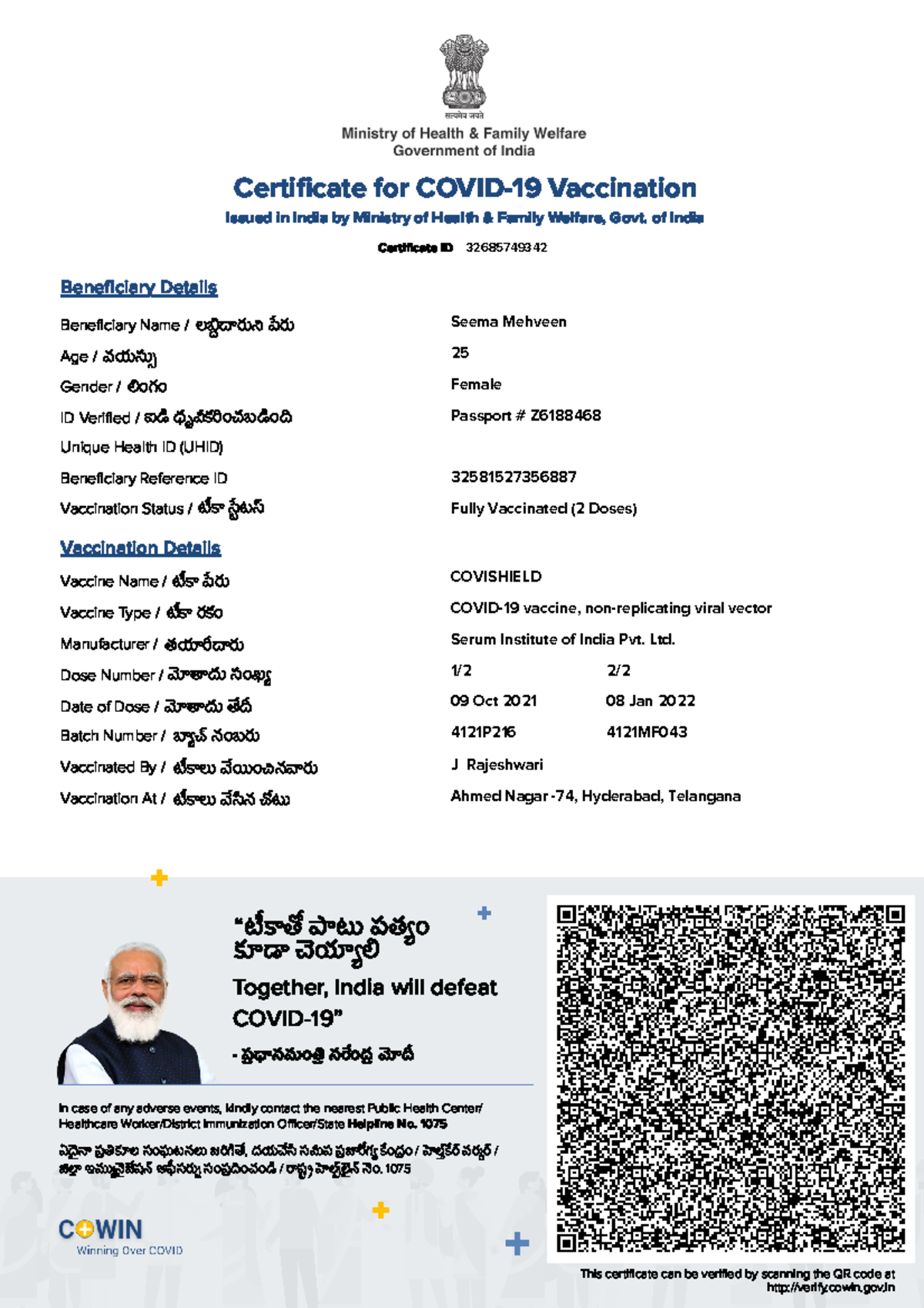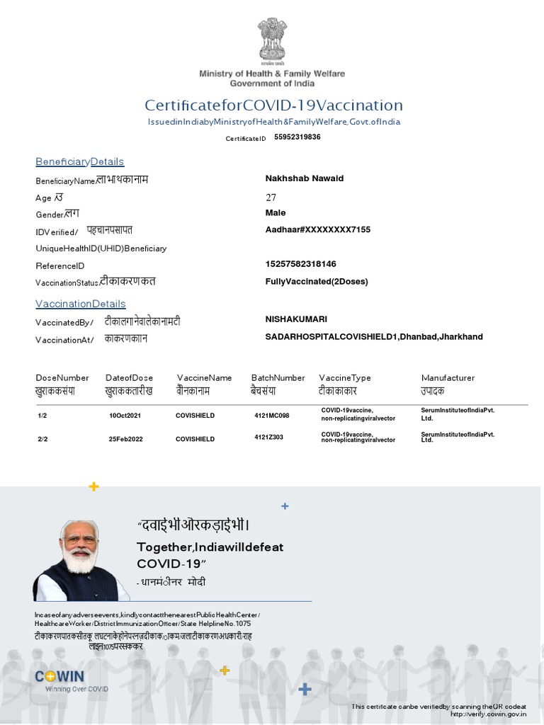 Certificate cowin gov COVID 19 Vaccination Certificate Issued in