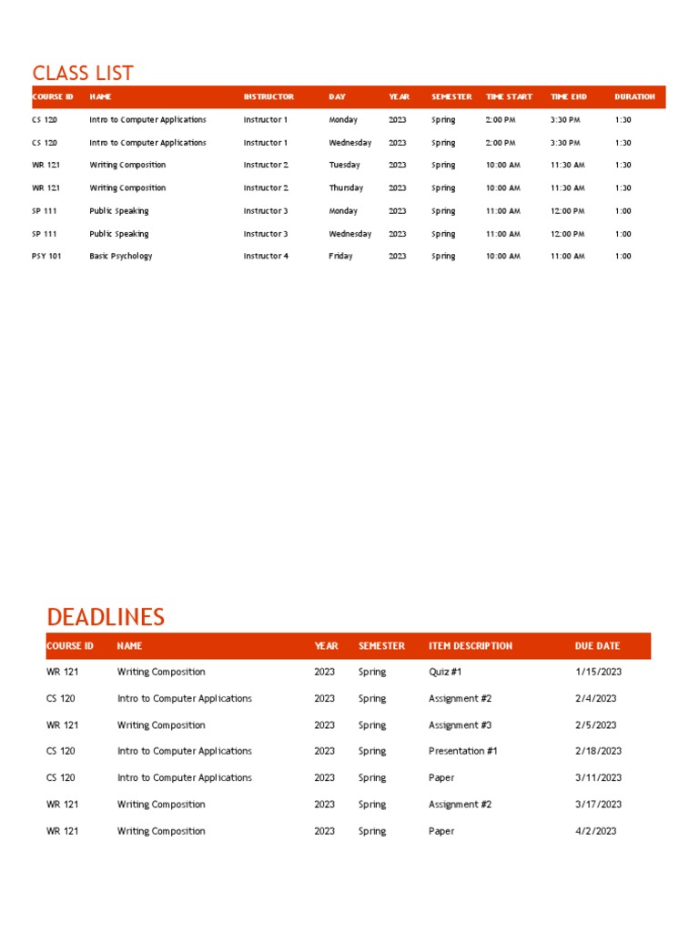 Semester Class Schedule Courses Automatically Drop Down Excel Template