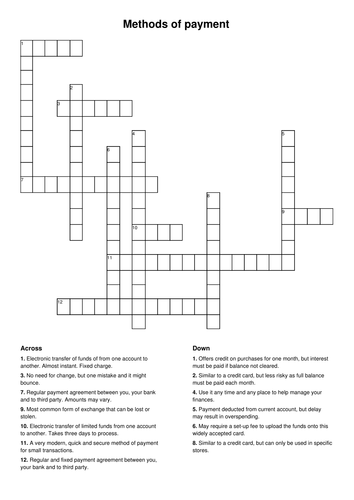 Unit 3: Payment Methods Crossword Teaching Resources