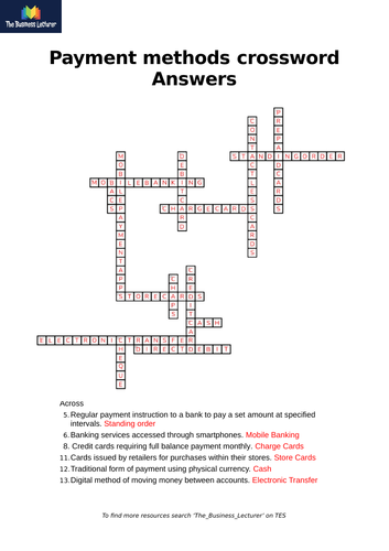 Methods of Payment Crossword and Answers Teaching Resources