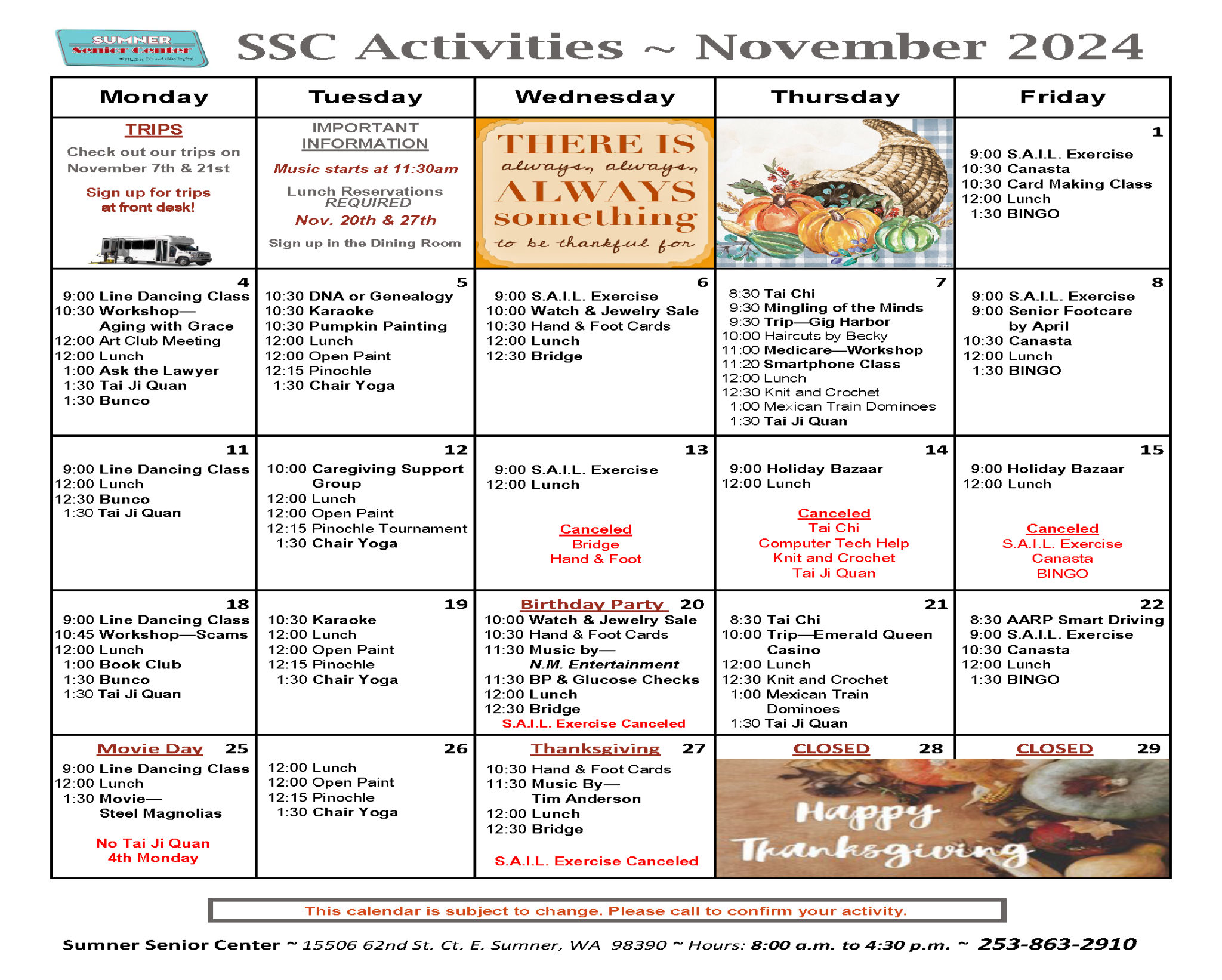 Calendar November 2024 Somerset Retirement Home and Assisted Living