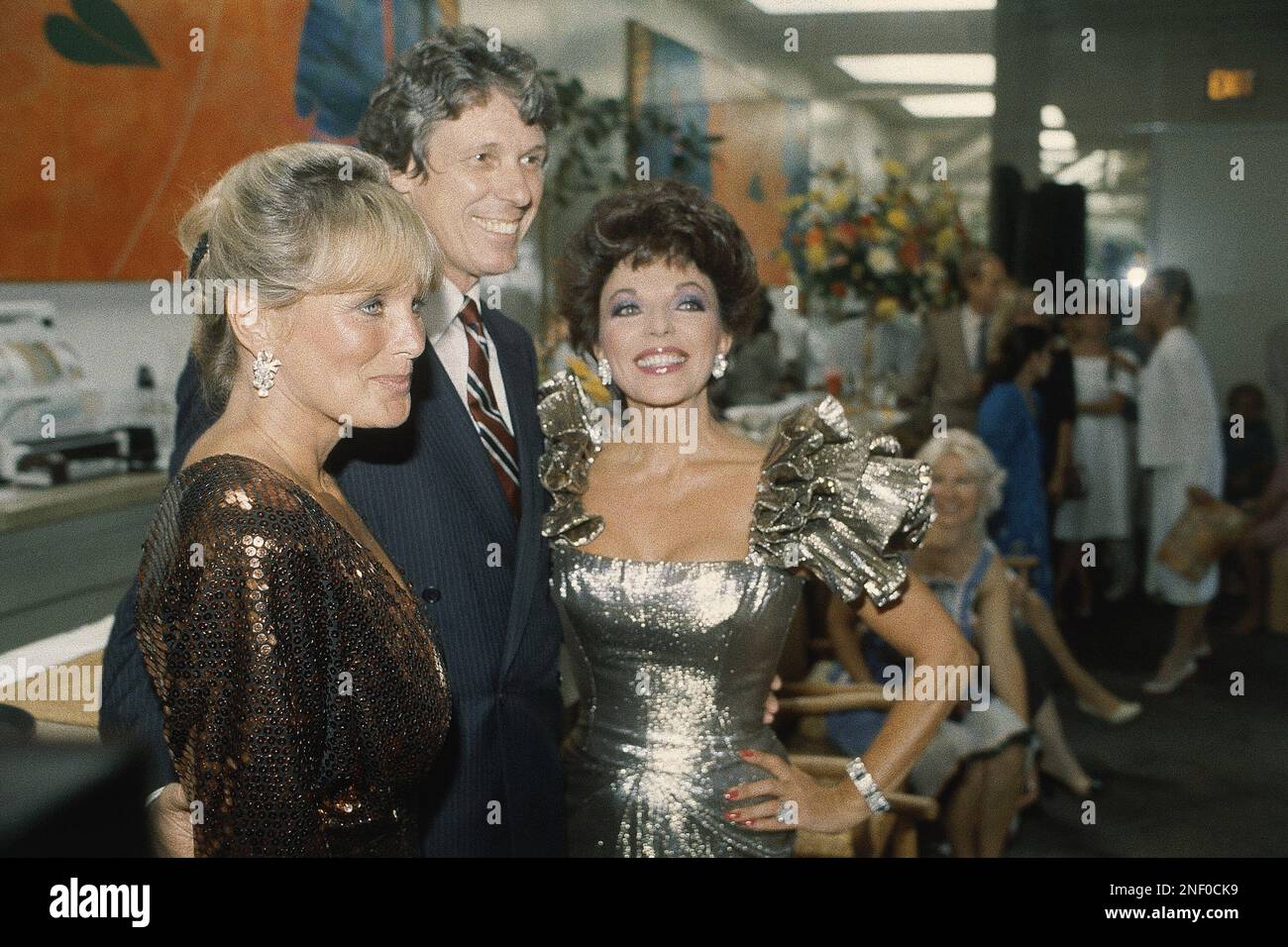 Joan Collins right poses with Linda Evans modeling Dynasty fashions