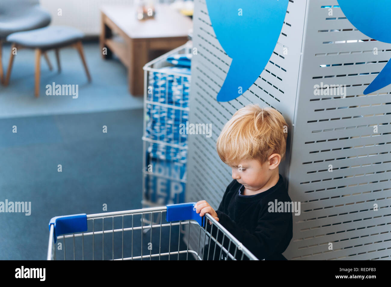 A little boy and a big cart in the supermarket Stock Photo Alamy