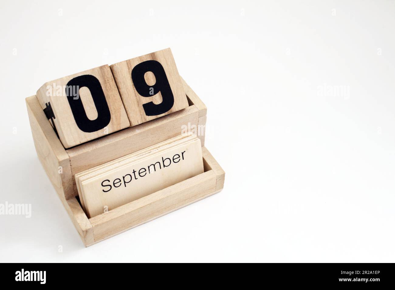 Wooden perpetual calendar showing the 9th of September Stock Photo Alamy