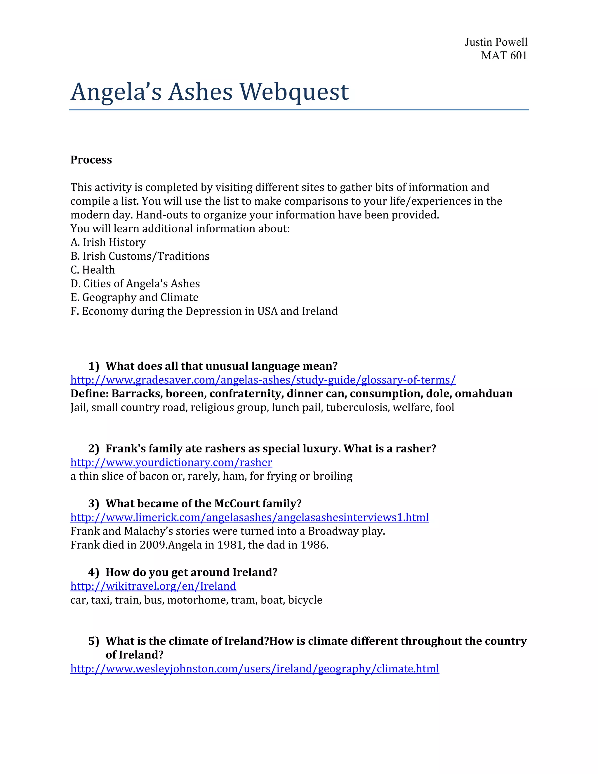 Webquest Angelas Ashes plus Answers DOCX Medical Health