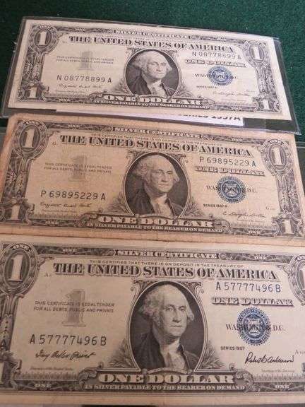 Three Silver Certificate one dollar bills two Series 1957 and one