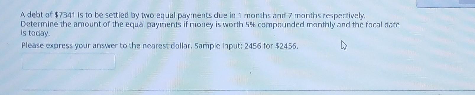 Solved A debt of $7341 is to be settled by two equal Chegg com