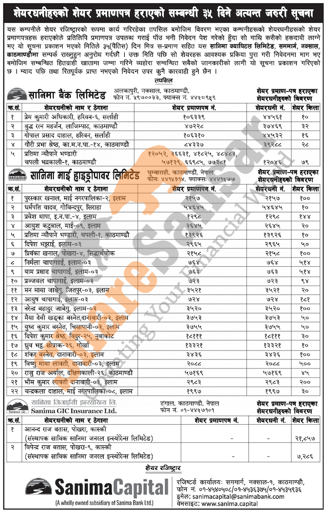 Sanima Bank Limited has published a notice regarding a claim for lost