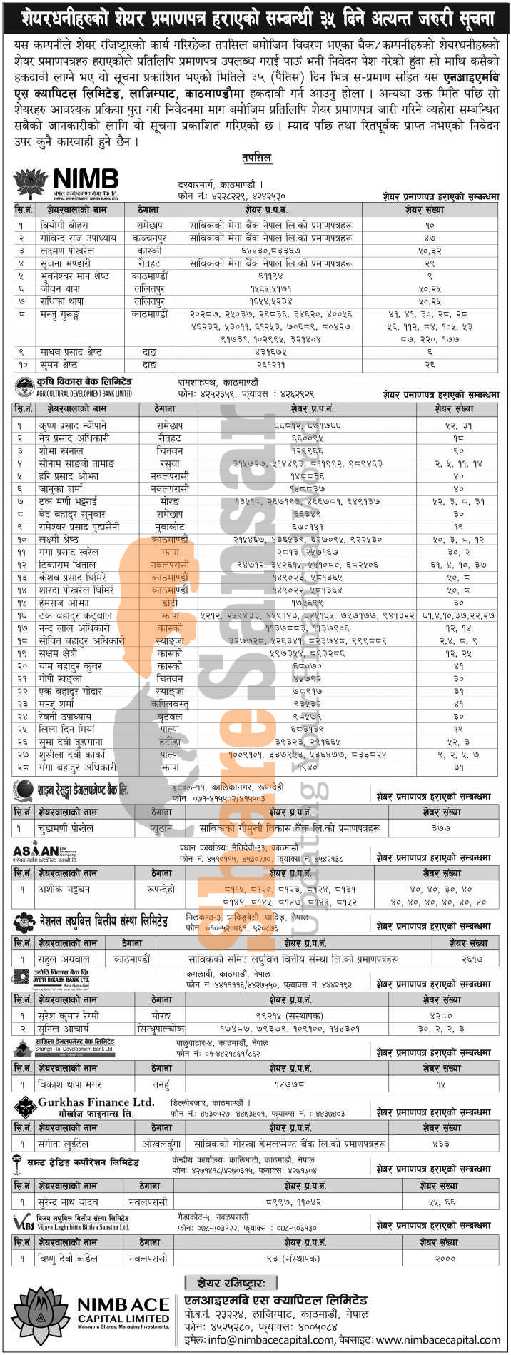 NIMB Ace Capital Limited has published a notice regarding a claim for