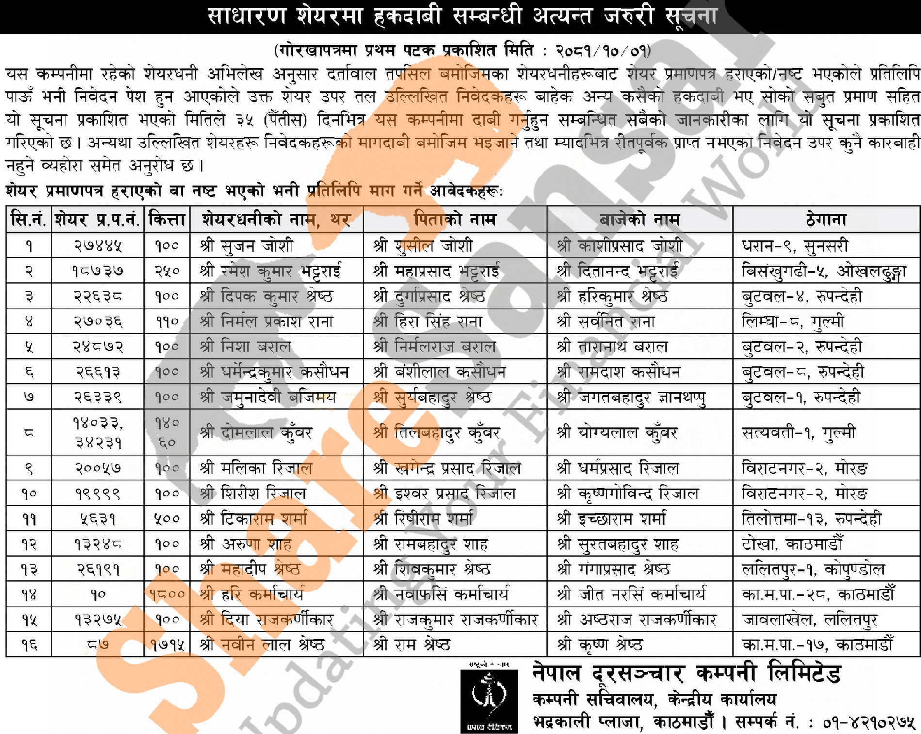 Nepal Doorsanchar Company Limited has published a notice regarding a