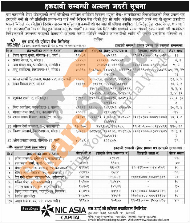 NIC Asia Capital Limited has published a notice regarding a claim for