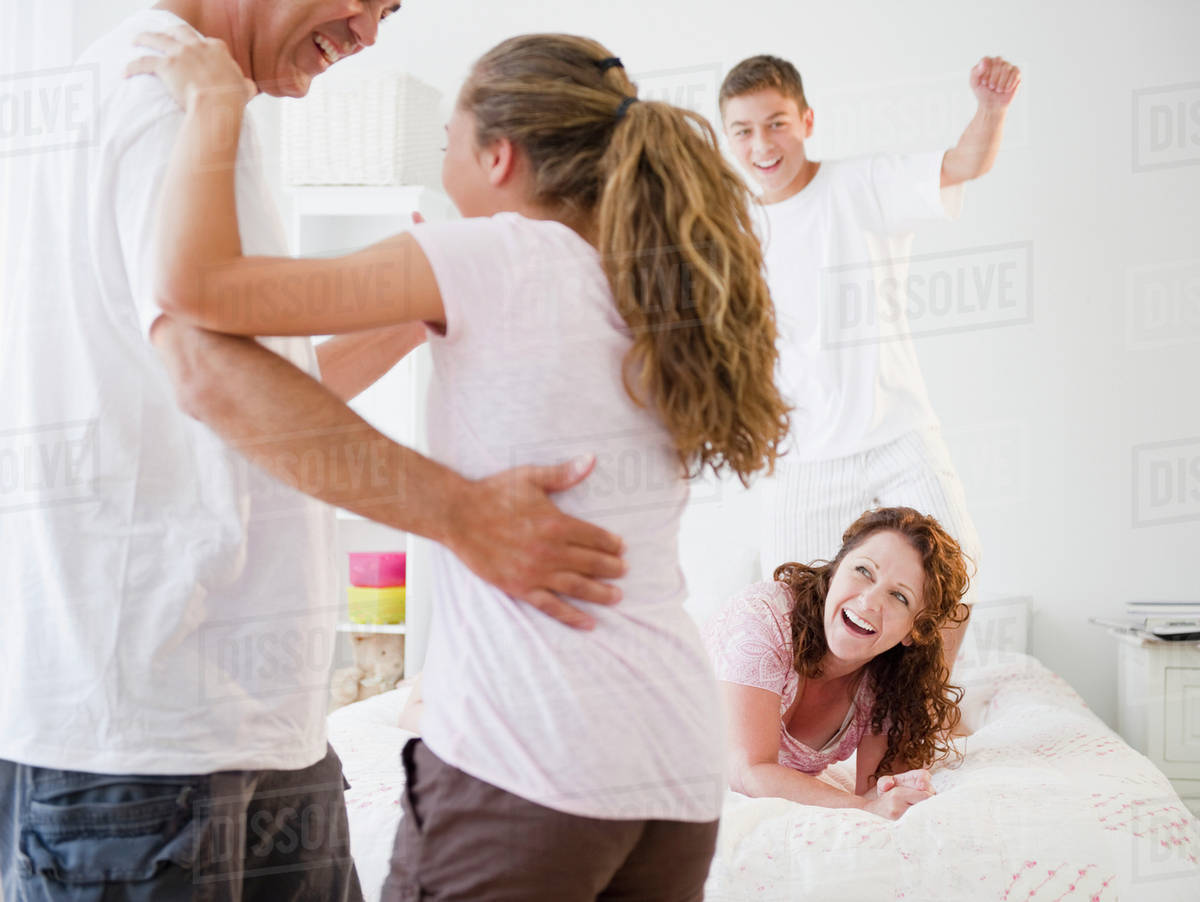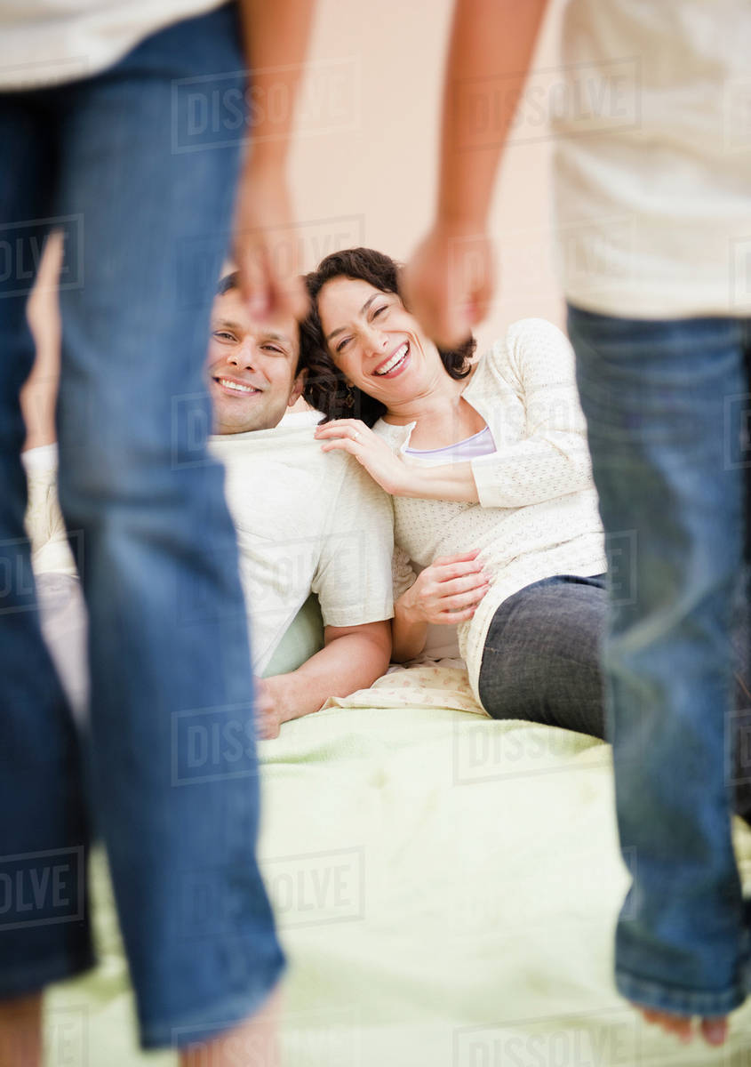 Parents watching daughters jumping on bed Royalty free Stock Photo
