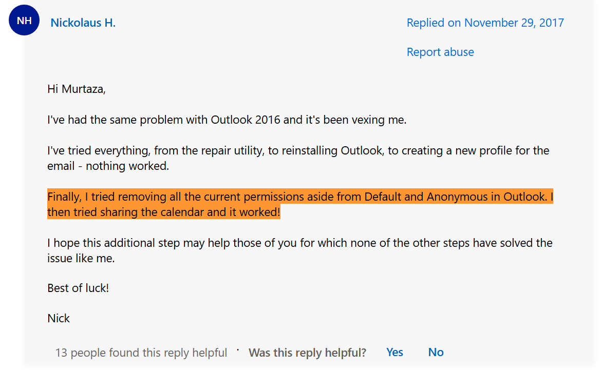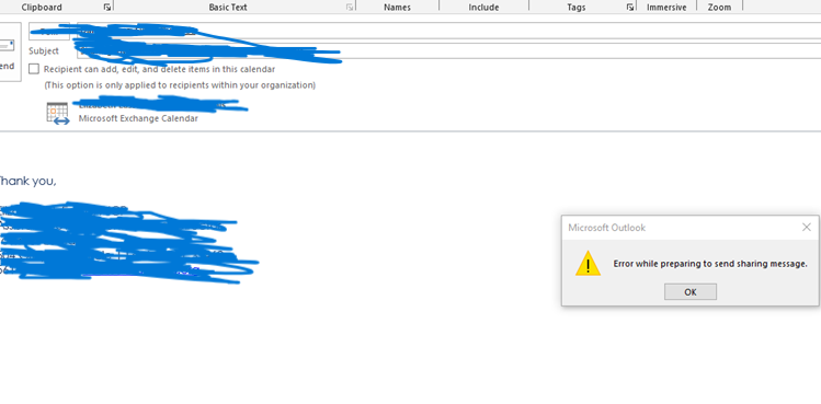 Sharing Outlook Calendar error: Error when preparing to send sharing