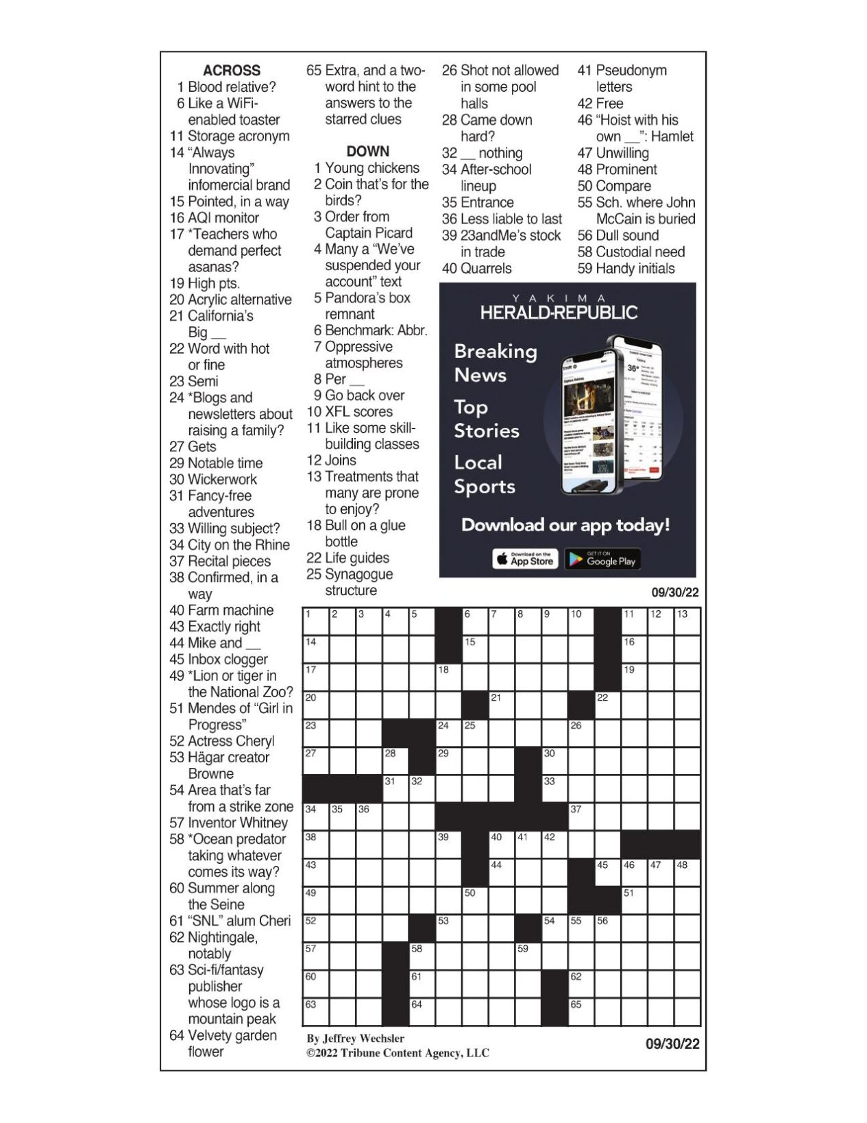 LA Times Crossword: Sept 30 2022 Crosswords yakimaherald com