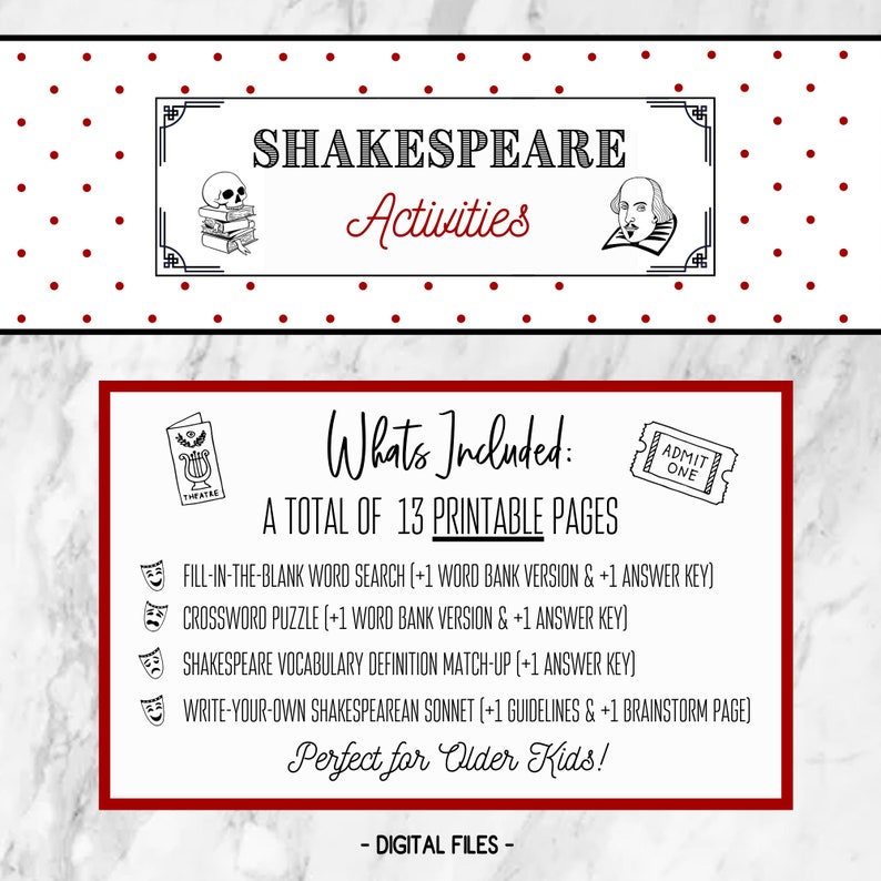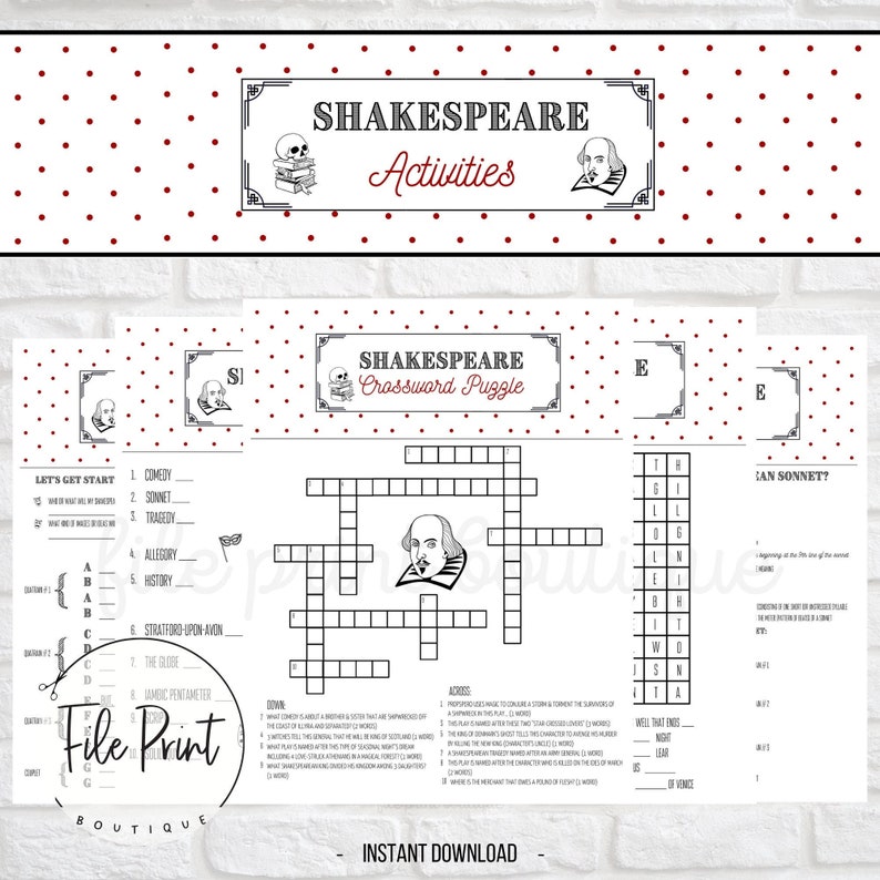 Shakespeare Crossword Puzzle Fun and Educational Activity