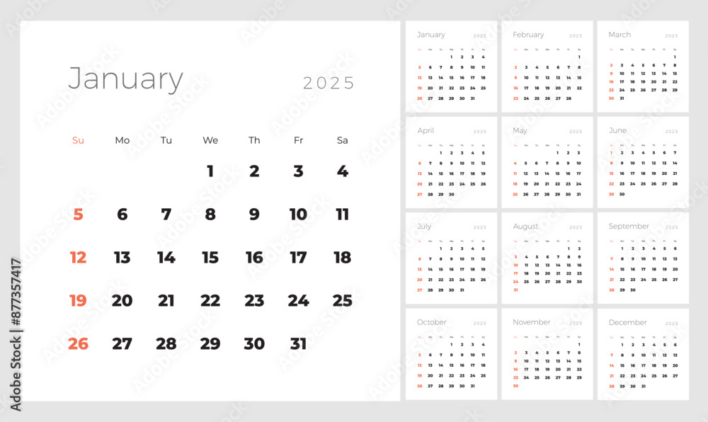 Monthly Calendar Layout For 2025 Planner Diary Vector Illustration