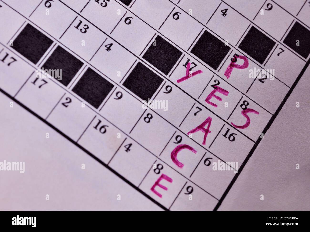 Close up of crossword puzzle with red pen showing words YES PEACE