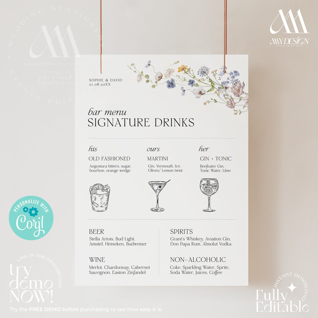 Editable Wedding Signature Drink Signs Printable Modern Drink Menu