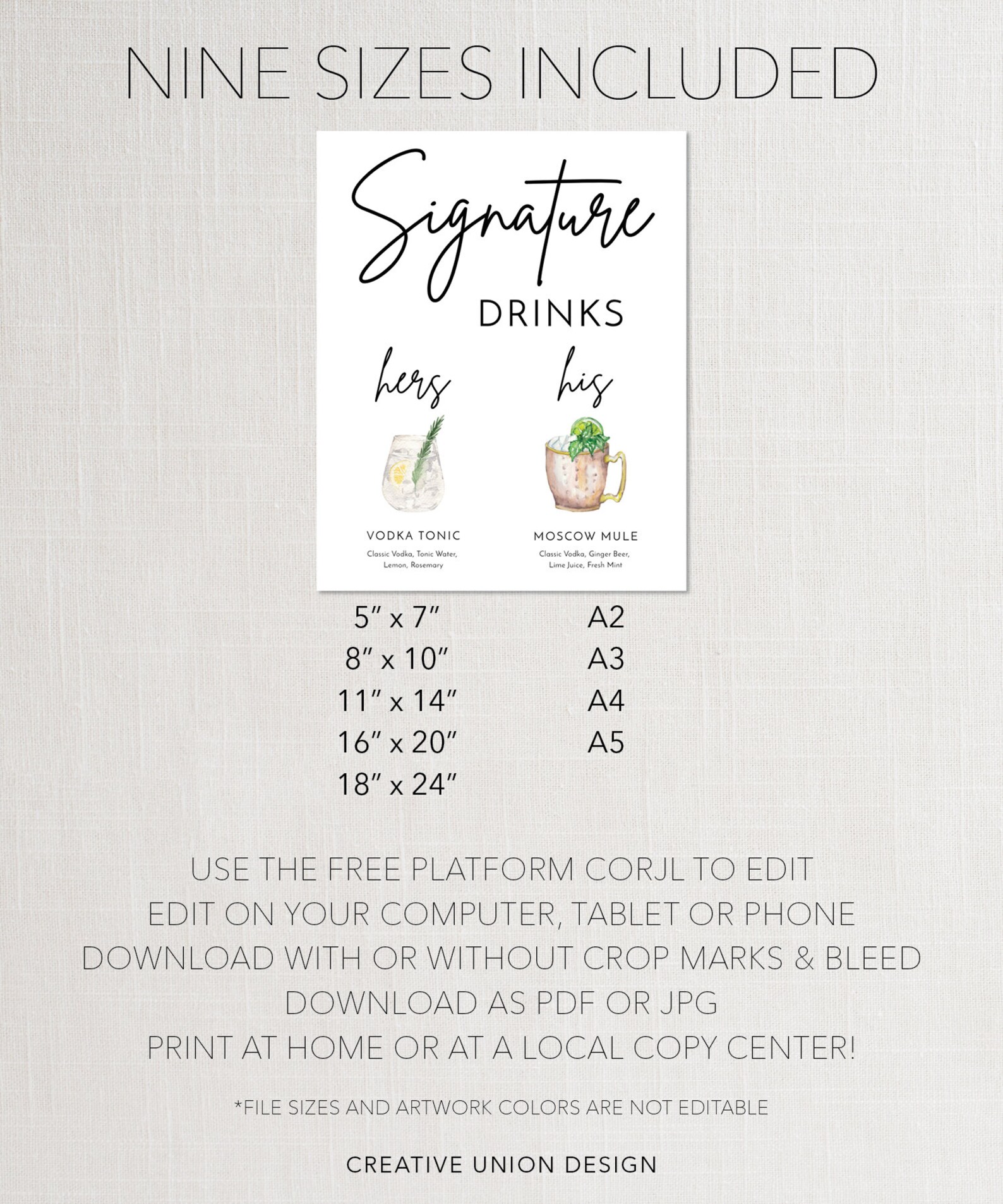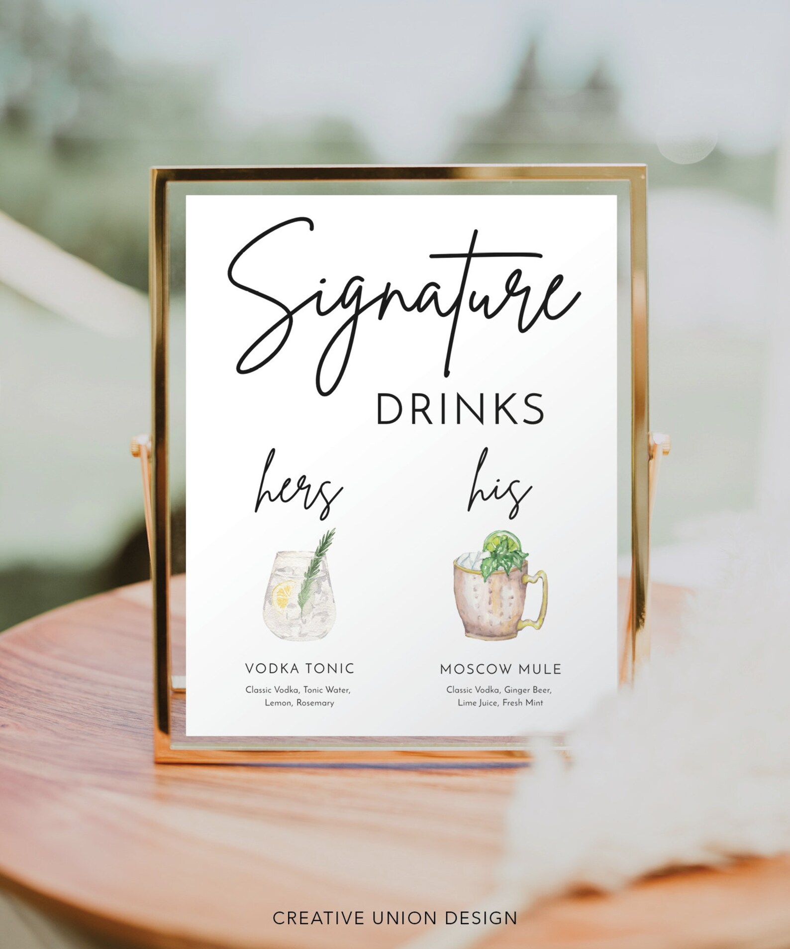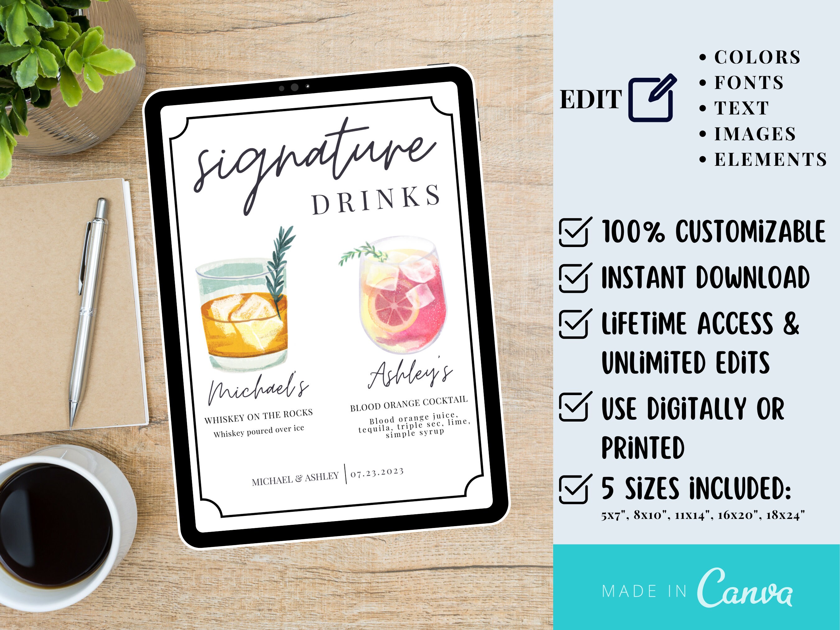 CLASSIC Customizable Signature Drink Sign Template Editable Signature