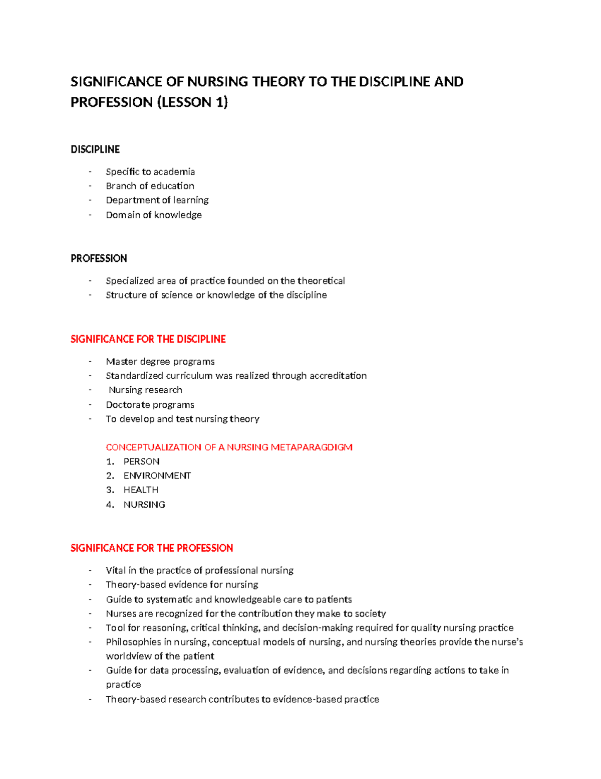 Significance of Nursing Theory to Discipline Profession (Lesson 1