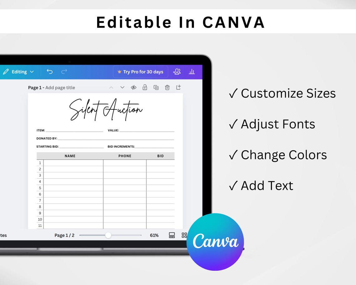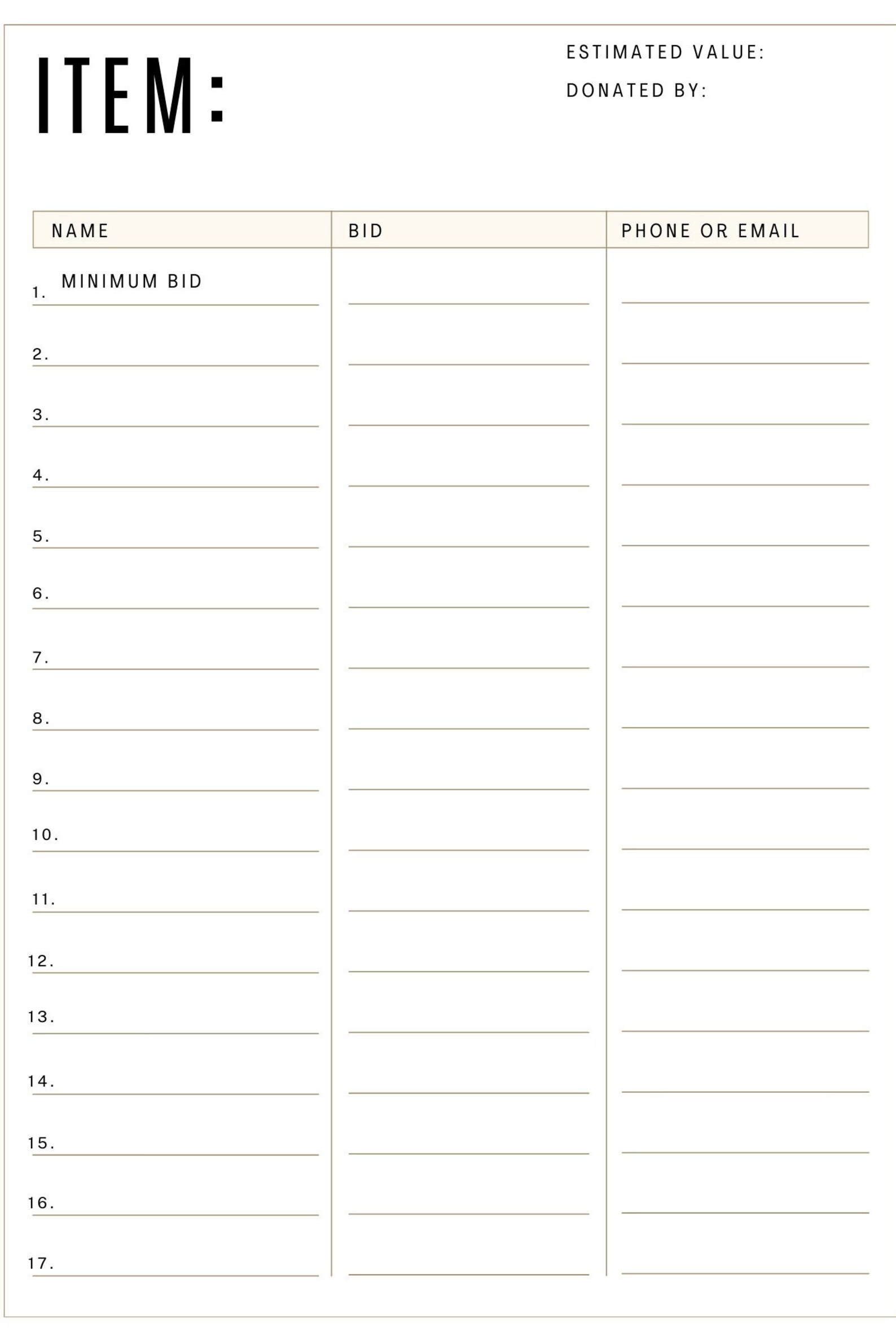 Silent Auction Bidding Template DOWNLOAD Etsy