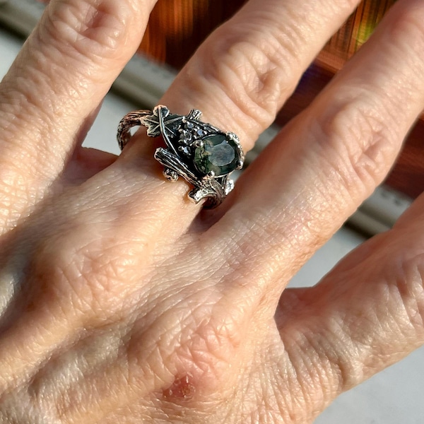 Natural Moss Agate Ring Silver Leaves Ring 925 Sterling Silver Ring