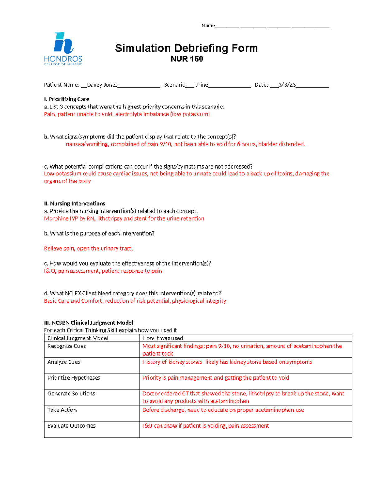 SDForm simulation debriefing form NUR 195 Student Name
