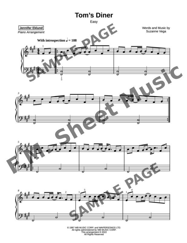 Tom s Diner (Easy Piano) By Suzanne Vega F M Sheet Music Pop