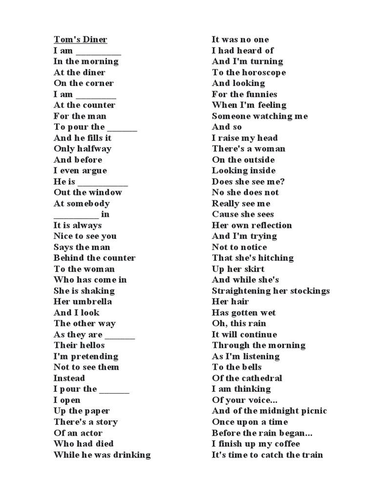 Song Worksheet: Tom s Diner by Suzanne Vega