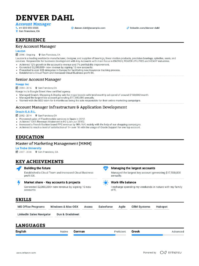 FlowCV Resume Template: Classic · Multi column · Serif · Black and