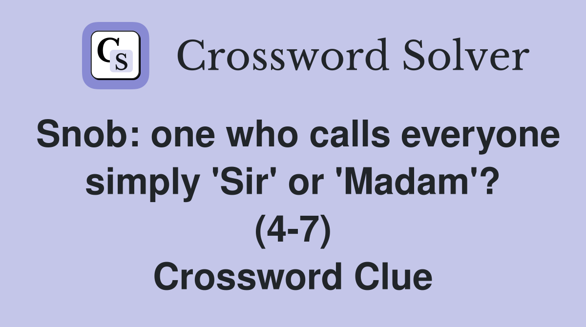 Snob: one who calls everyone simply #39 Sir #39 or #39 Madam #39 ? (4 7) Crossword