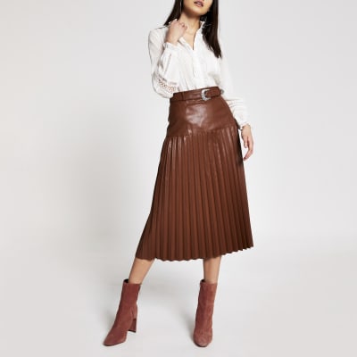 Brown faux leather pleated midi skirt River Island